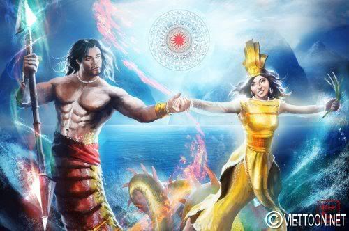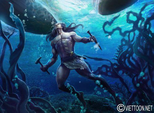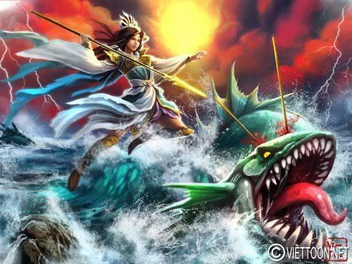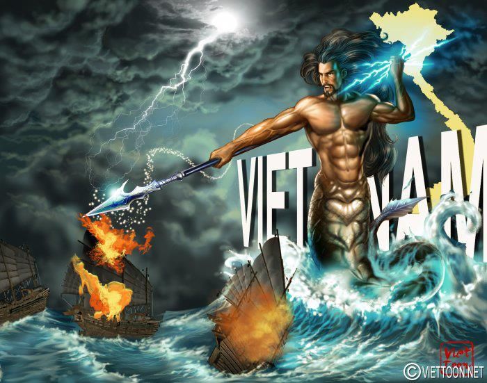 Cha Lạc Long Quân bảo vệ lãnh hải ! Cha Lạc Long Quân cầm giáo loại săn cá của ngư dân. Bán thân là rồng. Tranh vẽ theo lối fantasy.