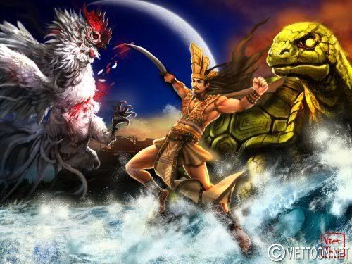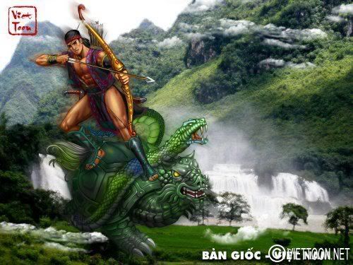 An Dương Vương Thục Phán chém yêu tinh gà trắng xây thành Cổ Loa với sự trợ giúp của thần Kim Qui. Gà trắng có lúc là biểu tượng của Tàu. Tranh vẽ theo lối fantasy art. Y phục của An Dương Vương phỏng tác theo hình ghi khắc trên trống đồng.