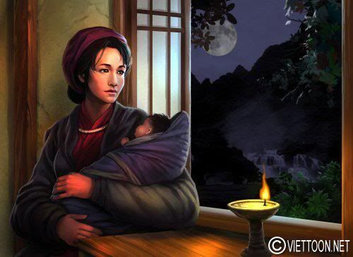 ![]() Chinh Phụ bế con trông chồng với bối cảnh thác Bản Giốc Cao Bằng, đây cũng là nơi có đá Vọng Phu