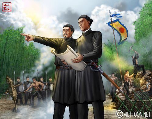 ![]() Đinh Công Tráng và Phạm Bành cùng nghĩa quân tại căn cứ Ba Đình được bao bọc bởi lũy tre dày. Lá cờ của triều Nguyễn và phong trào hưởng ứng hịch Cần Vương.