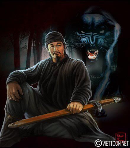 ![]() Mai Hắc Đế Mai Thúc Loan. Vẽ theo lối fantasy art. Y phục Mai Hắc Đế theo y phục của người Tây Nguyên. Ông mạng Thủy nên dùng màu đen và cỡi trên lưng con Huyền Vũ. Gợi ý niệm về Kinh Dịch / Ngũ Hành mà theo một số học giả ngày nay phát hiện cũng có phần khởi xuất từ Việt nam. Trong tranh là thác Bản Giốc. Thác nước của Việt Nam