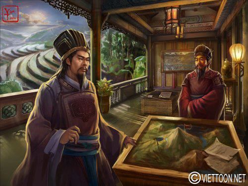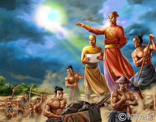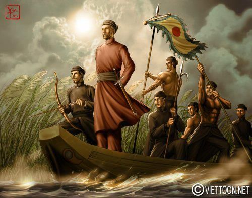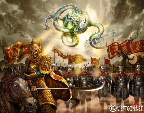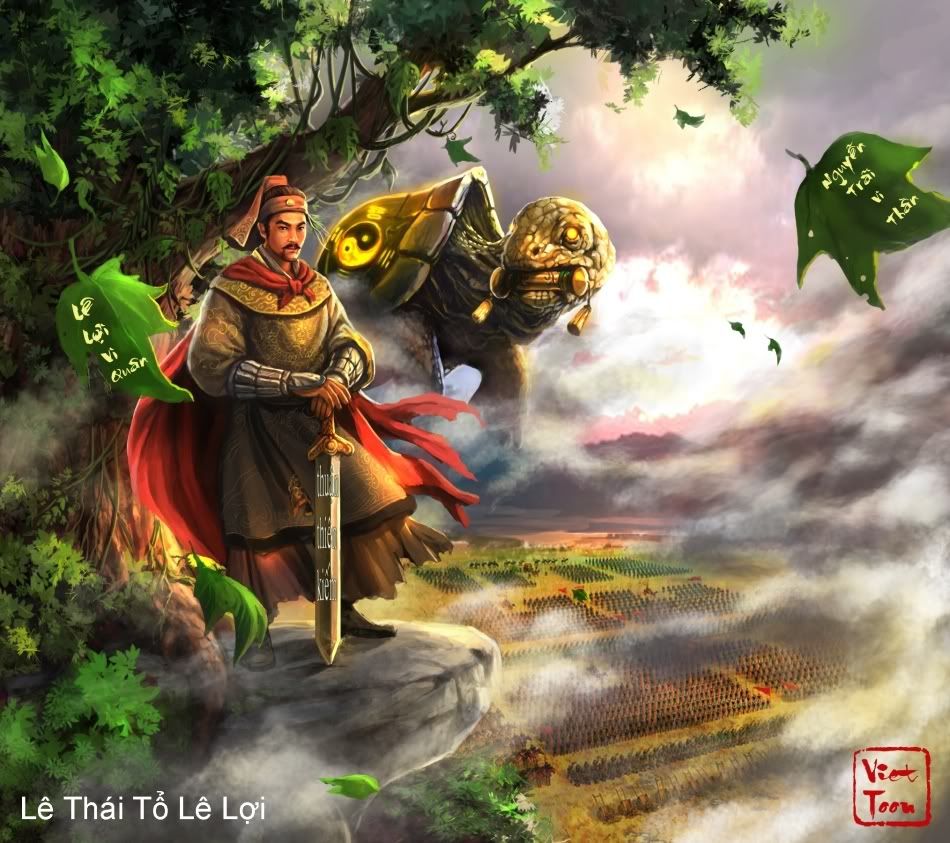 ![]() Vua Lê Thái Tổ Lê Lợi trong cuộc kháng chiến chống quân xâm lược nhà Minh. Tranh vẽ theo lối fantasy art. Có thần Kim Qui dâng Thuận Thiên Kiếm. (Trên mai rùa có ký hiệu của Ngũ Hành Âm Dương: gợi ý về các khám phá hiện nay cho thấy thuyết này cũng có phần bắt nguồn từ Việt Nam). Trong tranh có các chiếc lá với dòng chữ “Lê Lợi Vi Quân, Nguyễn Trãi Vi Thần” theo kế sách của Nguyễn Trãi
