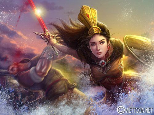 ![]() Bà Triệu – Tranh vẽ theo lối fantasy art thể hiện lời nói hào hùng của bà “đạp sóng dữ, chém cá kình”. Trong bức vẽ này dùng y phục của bà theo y phục thường thấy của tranh vẽ tiên nữ, cũng với ý niệm các anh hùng Việt Nam cũng như thần tiên giáng trần