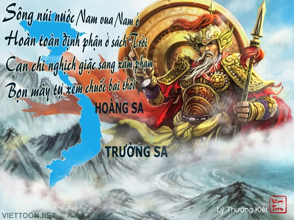 ![]() Lý Thường Kiệt và bài thơ Nam Quốc Sơn Hà – Hình Lý Thường Kiệt được phỏng theo các pho tượng Hộ Pháp Thần tại chùa cổ Việt Nam. Ví ông cũng như các vị anh hùng Việt nam là những vị thần thánh giáng trần bảo vệ non sông. Bức tranh này được làm đặc biệt để yểm trợ tinh thần yêu nước, gìn giữ giang sơn tổ tiên đặc biệt hai quần đảo Hoàng Sa và Trường Sa