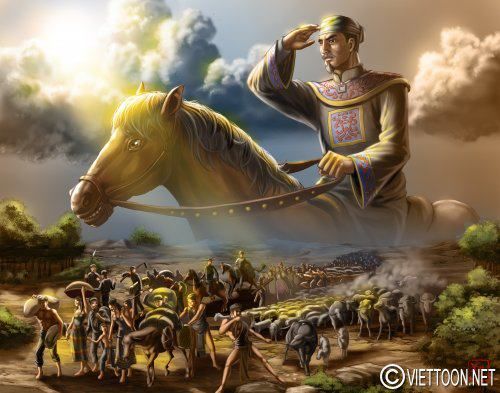 ![]() Đinh Tiên Hoàng Đinh Bộ Lĩnh được biết tới tài năng quân sự khi còn nhỏ tuổi đã bày trò cỡi trâu đánh trận. Tranh vẽ theo lối fantasy art với ý tưởng đưa hình ảnh cỡi trâu và cờ lau gắn bó với Đinh Bộ Lĩnh. Tranh cũng muốn đưa ý niệm thần thánh hóa những anh hùng lịch sử Việt nam, không chịu thua kém Trung Hoa.