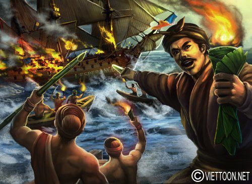 ![]() Nguyễn Trung Trực cùng nghĩa quân cải trang thương buôn đột kích đốt cháy tàu Pháp trên sông Vàm Cỏ. Di ảnh chân dung ông được dùng trong tranh và các bó đuốc lá dừa đặc trưng của miền Nam.