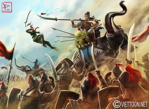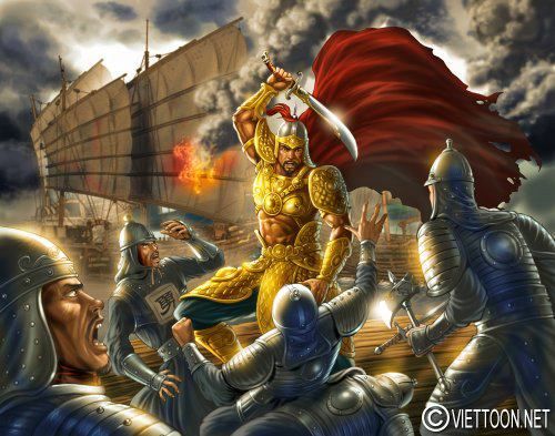 ![]() Ngô Vương Ngô Quyền và trận đánh đi vào lịch sử trên sông Bạch Đằng. Tranh vẽ theo lối fantasy art và luật phối cảnh của lối truyện tranh mới. Y giáp được dựa theo một số tranh cổ và sự tưởng tượng. Bàn tay vung ra nắm đấm với ý nói: sẽ đập tan mọi cuộc xâm lược