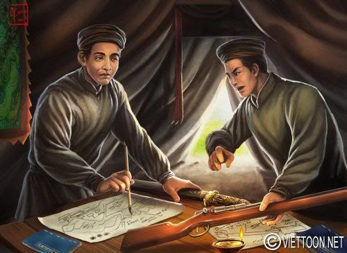 ![]() Phan Đình Phùng và Cao Thắng. Hình vẽ được họa theo di ảnh của Phan Đình Phùng. Cao Thắng bên cạnh, tay cầm súng trường vì ông là người đã sáng chế súng cho nghĩa quân.