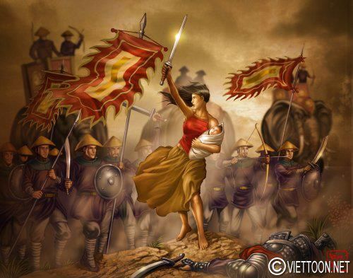 ![]() Phùng Thị Chinh – một nữ tướng thời Hai Bà Trưng. Tương truyền bà vừa sanh xong đã dẫn quân đánh giặc. Tranh vẽ theo lối fantasy art và ronmanticism, một tay bồng con, một tay cầm kiếm đôn đốc quân sĩ tiến lên.