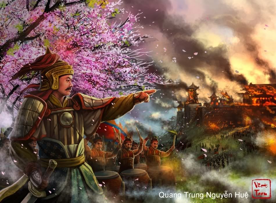 ![]() Quang Trung Nguyễn Huệ đang tiến quân đánh phá giặc Thanh vào dịp tết (có cành đào đất Bắc) Bộ trống trận danh tiếng của nghĩa quân Tây Sơn. Hình ảnh Nguyễn Huệ được vẽ theo các di ảnh còn lưu lại.