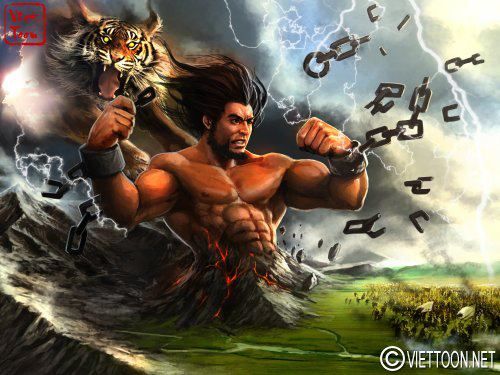 ![]() Trần Bình Trọng thà chết không hàng. Với lối vẽ fantasy art muốn đưa ý niệm “Sinh vi tướng, tử vi thần” của các anh hùng Việt nam. Khi họ chết hồn phách tạc vào non sông để bảo vệ đất nước. Hình ảnh mãnh hổ như “chúa tể sơn lâm” và cũng là hình ảnh dùng chỉ cho các vị tướng soái (hổ tướng). Bức gông xiềng vươn dậy từ núi rừng, nước Việt Nam dù bị cai trị ngắn hay dài rồi cũng sẽ có ngày bùng lên quật khởi.