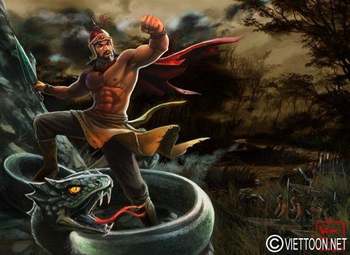 ![]() Dạ Trạch Vương Triệu Quang Phục. Vua đầm lầy! Tranh vẽ theo lối fantasy art với hình ảnh một Xà Vương theo phò giúp Triệu Quang Phục (đầm Dạ Trạch có nhiều rắn là một yếu tố gây trở ngại cho các cuộc tấn công của giặc)